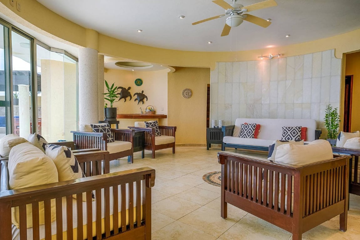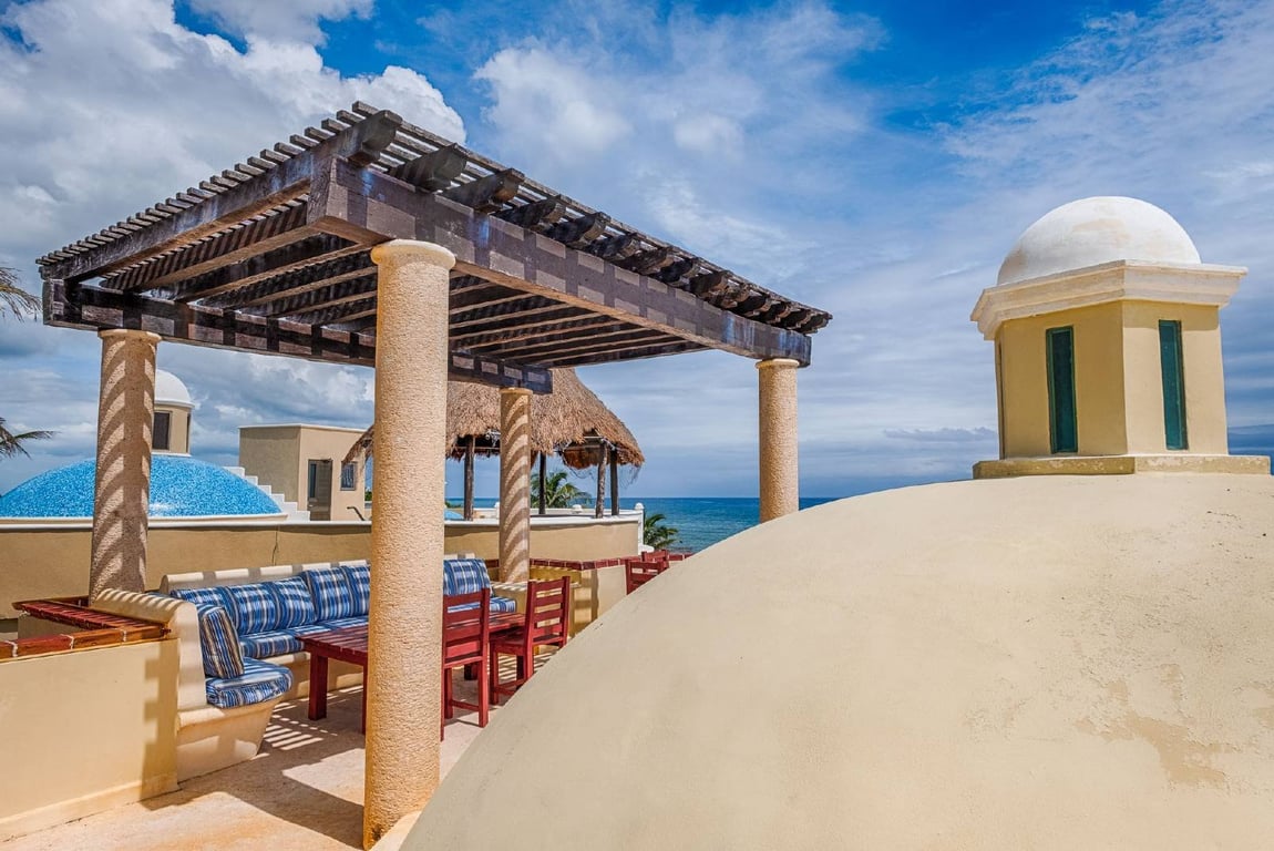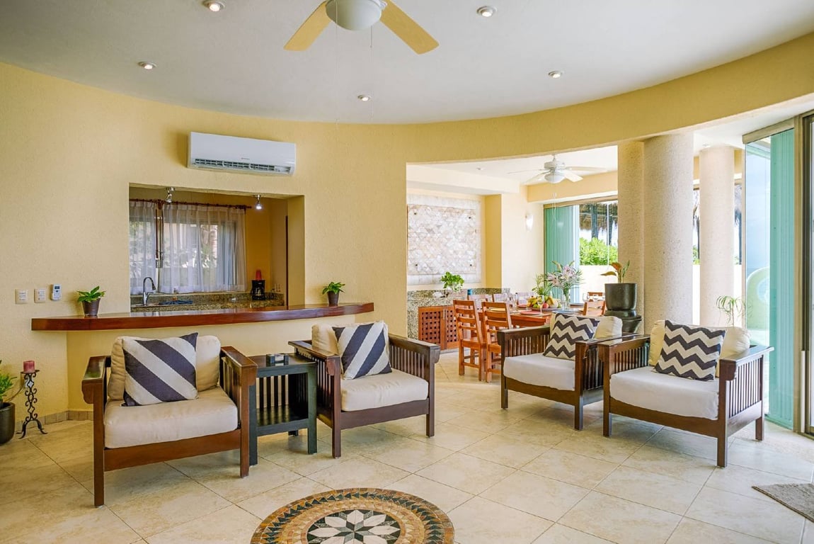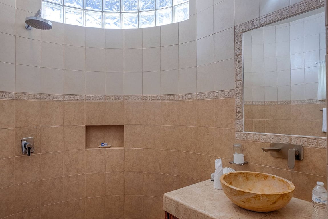 The villa's design honors traditional Mexican architecture while embracing contemporary coastal living. A handcrafted brick cupula crowns the second-story entertainment room, creating visual interest and natural ventilation that speaks to generations of tropical building wisdom. Throughout the 4,300 square feet of interior space, warm textures and thoughtful details create spaces that feel both refined and welcoming.