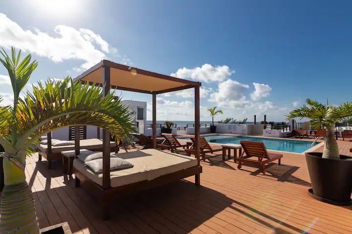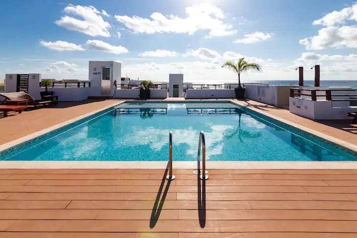The building features two resort-style pools - a ground-level pool and a rooftop infinity pool overlooking the sea. Luxury amenities include a spa, gym, business center, children's club, central bar, and deli market, all complemented by concierge service and beach club membership.