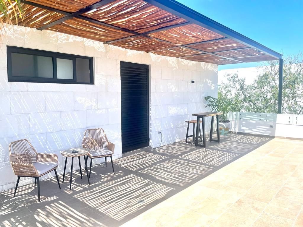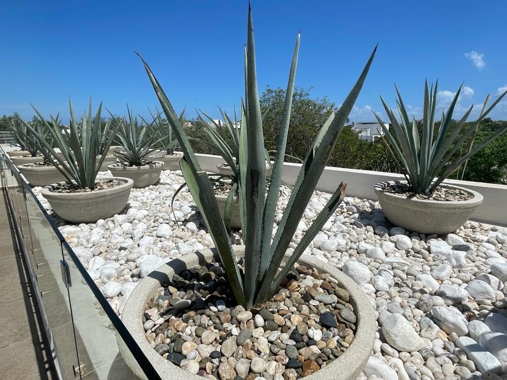 Perhaps most extraordinary are the outdoor living spaces that truly set this residence apart. Your own private pool, accessed via elegantly stepped stone platforms and framed by lush vertical greenery, offers a refreshing personal oasis just steps from your living area. Two private rooftop terraces — a rare luxury even at this level — expand your entertaining and relaxation possibilities dramatically. One terrace features a stunning palapa-style wooden pergola ceiling with modern lounge furniture and bar-height seating, creating an ideal sunset cocktail venue or alfresco dining room beneath the stars. The landscaping throughout draws on the Riviera Maya's natural palette, with sculptural agave plants set among white river stones creating a zen-like desert garden atmosphere.