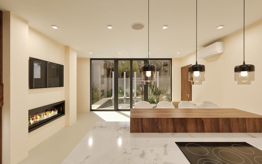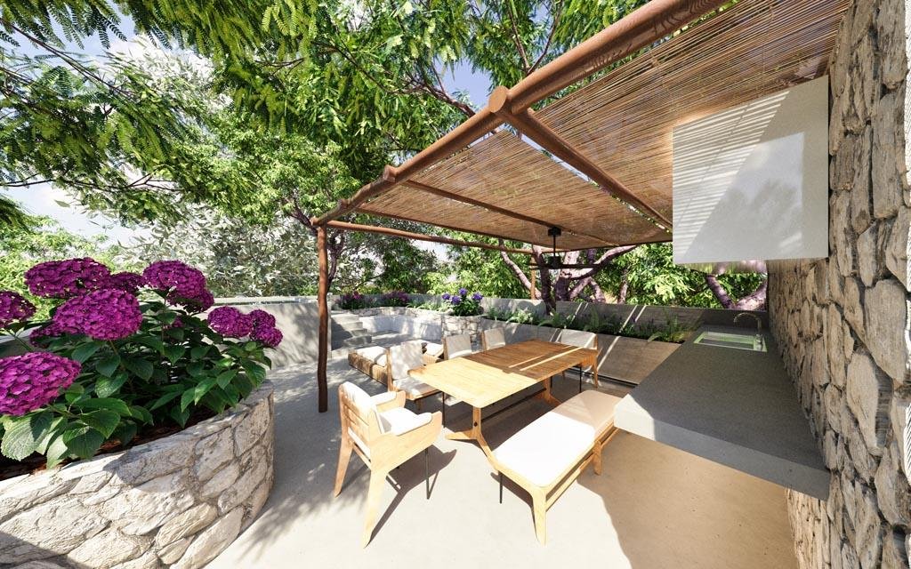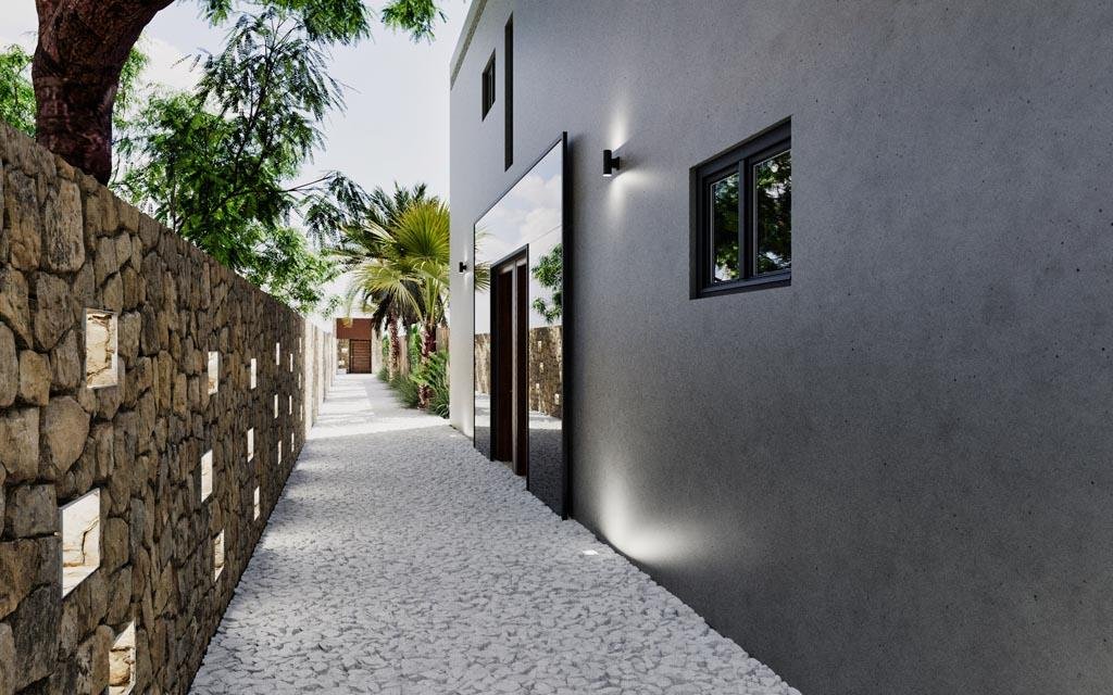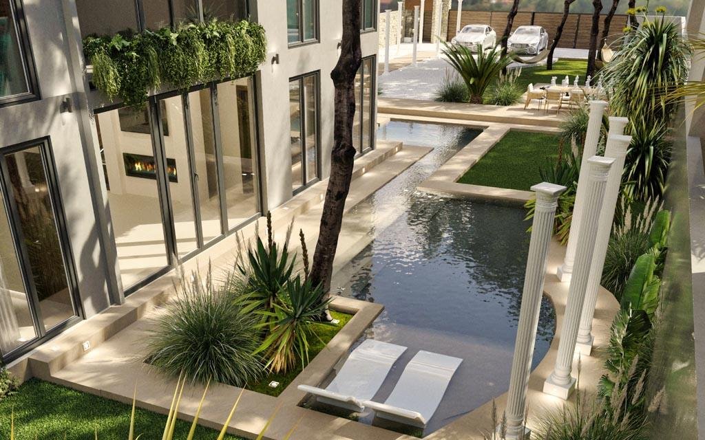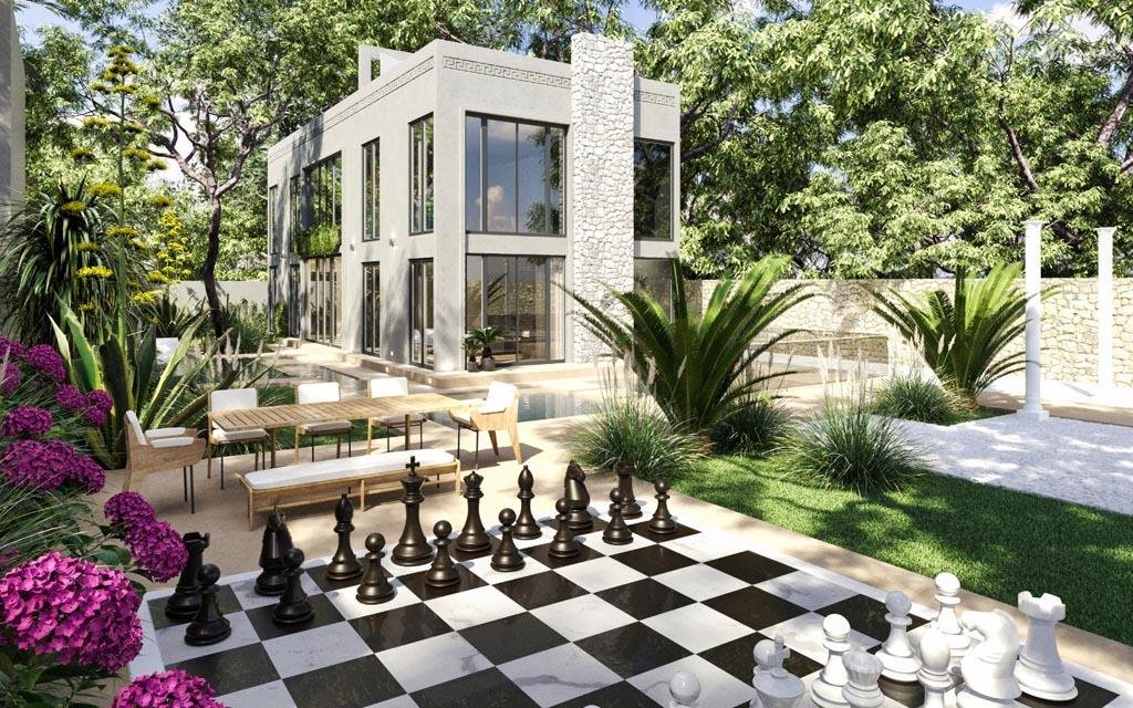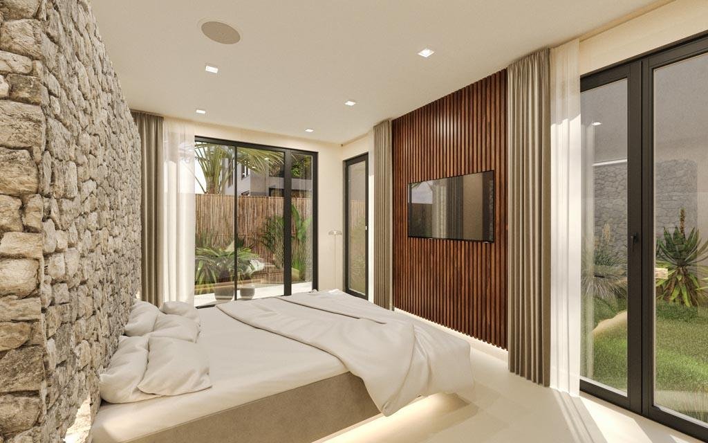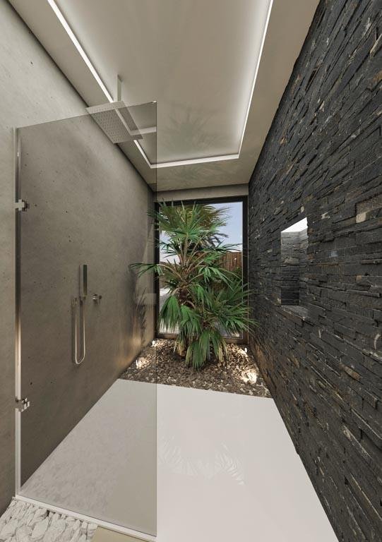 The ground floor makes a stunning impression with its enormous pool featuring integrated sun loungers and jacuzzi jets. A striking two-meter waterfall graces the entrance, while a mature tree grows through the villa's heart, creating a mesmerizing connection with nature. The 114.5-square-meter rooftop crowns the property with a second pool, custom seating, and an outdoor kitchen beneath a stylish pergola.