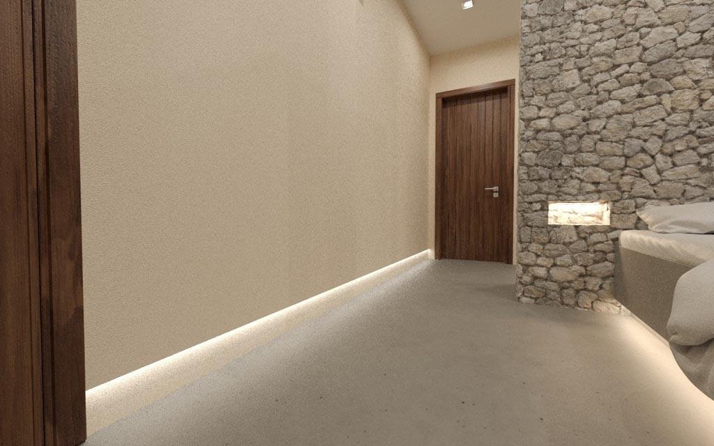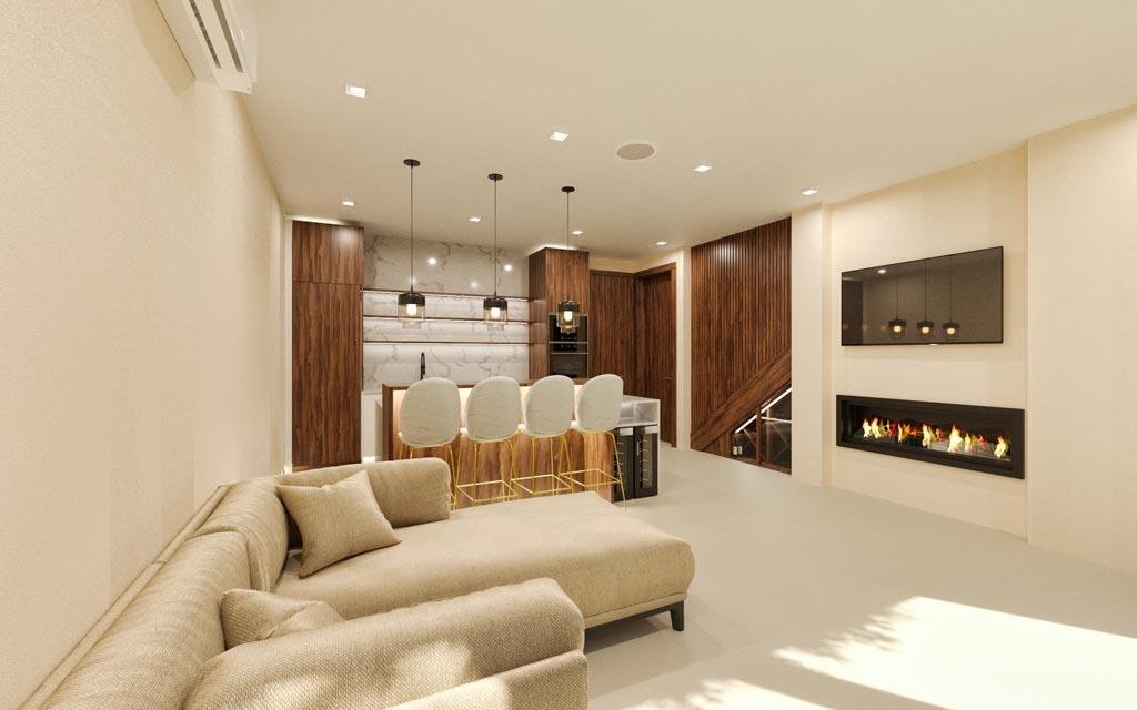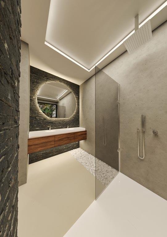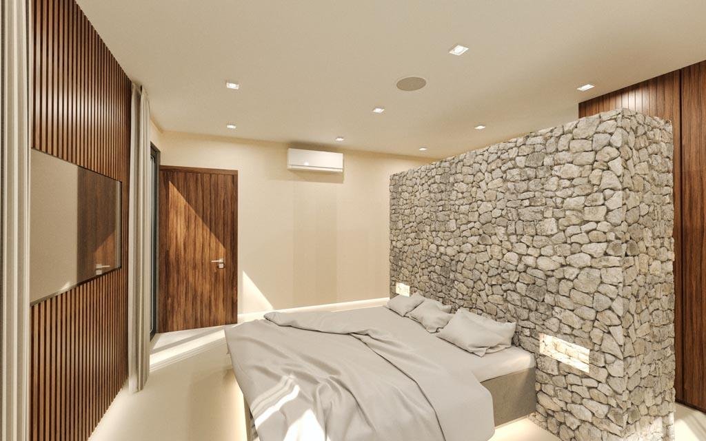 Each bedroom is a sanctuary of comfort, featuring king-size beds with stone-black accent walls, integrated 50" TVs, and sophisticated LED lighting systems. The bathrooms elevate luxury with floating double basins, rainfall showers, and Italian quartz tile features. Smart touches include USB charging points and wardrobes with automatic lighting.