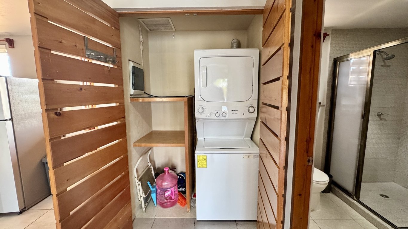 Inside, the recently updated kitchen comes fully equipped with appliances including a modern cooktop and washer-dryer combination. The spacious bedroom faces the marina, allowing fresh Caribbean breezes to flow through when weather permits, while air conditioning ensures comfort during the warmer summer months. The open layout maximizes the feeling of space throughout the 883 square feet, with bright natural light enhancing the living areas.