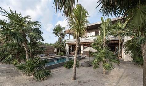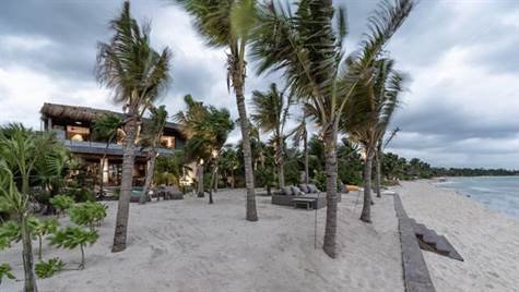 Discover Villa Moloch, where the ancient Mayan word for "together" comes alive through exceptional design and unparalleled coastal luxury. This magnificent 5-bedroom, 5.5-bathroom beachfront estate spans 680 square meters and commands 20 meters of pristine white sand beach frontage on the exclusive Soliman Bay.