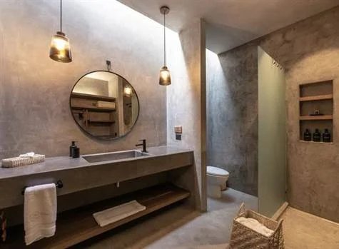 Villa Moloch's design philosophy centers on bringing people together while respecting individual privacy needs. The open floor plan creates natural gathering spaces using organic surfaces and gleaming concrete walls complemented by sophisticated wooden furnishings. Every detail has been considered, from the chef-level kitchen with wood-fired oven to the thoughtfully positioned common balcony where each bedroom enjoys access.