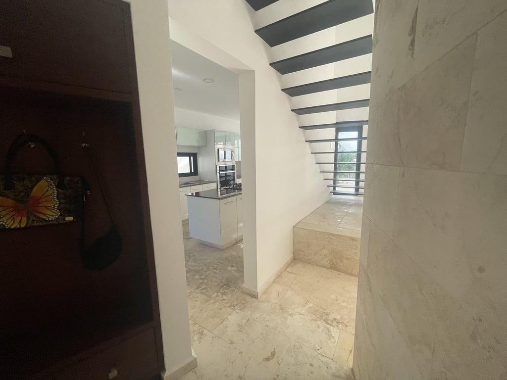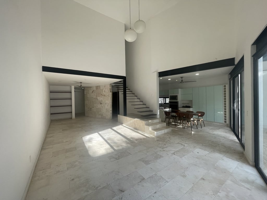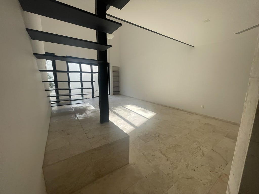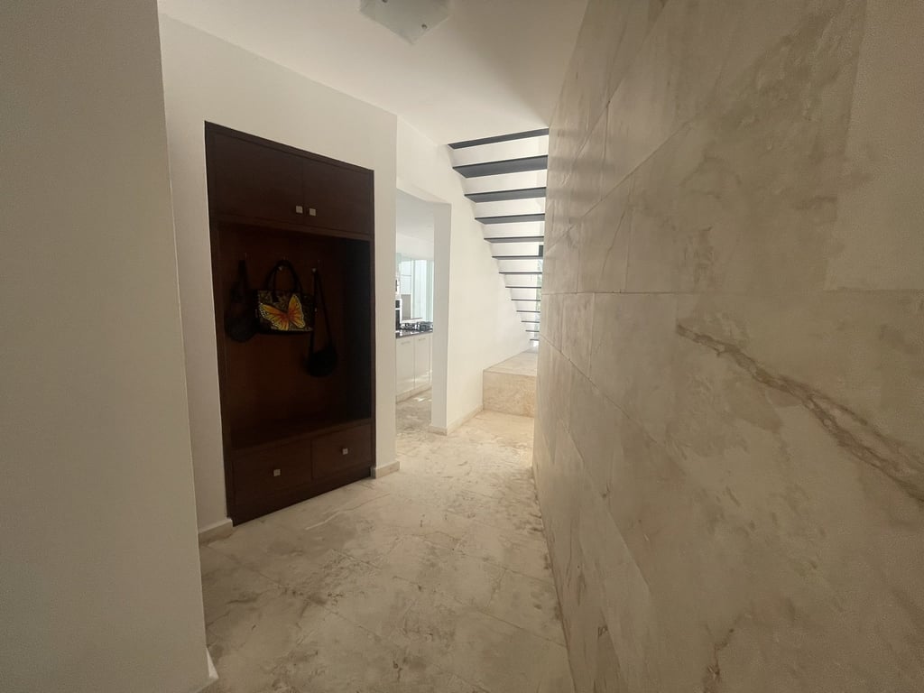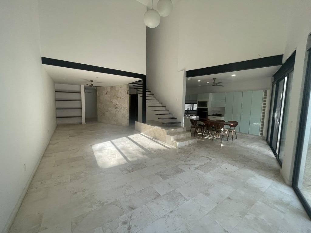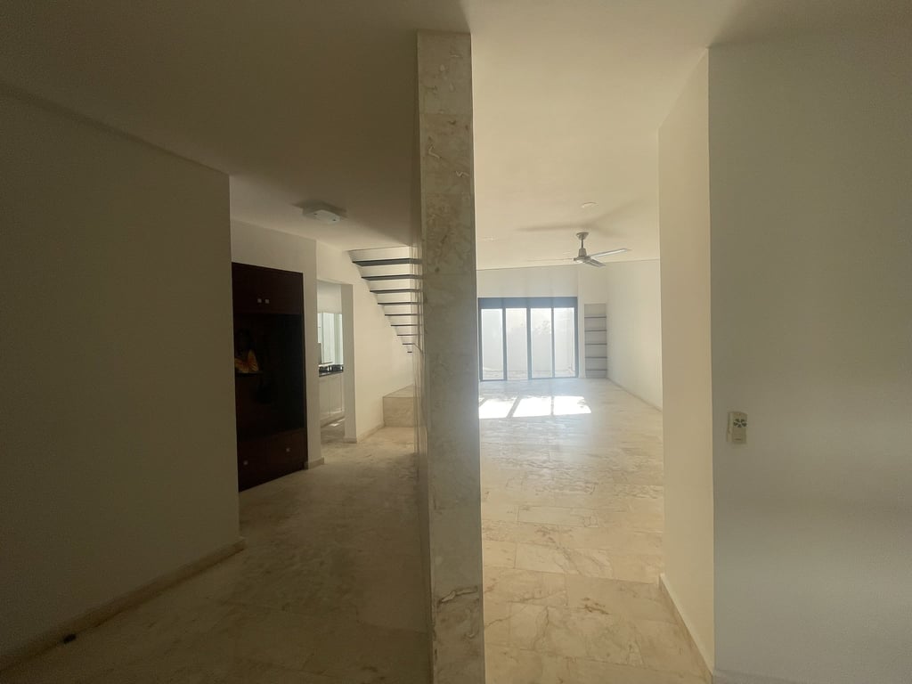 Upon arrival, the dramatic double-height dining area immediately captivates with its soaring ceilings and flood of natural light that dances across luminous marble floors throughout the day. The open-concept ground floor unfolds with remarkable fluidity, where the spacious living room connects seamlessly to a private terrace through expansive sliding doors, creating that coveted indoor-outdoor lifestyle essential to tropical luxury living. The modern kitchen stands as the heart of the home, featuring gleaming granite countertops, a generous breakfast bar island perfect for casual gatherings, and premium finishes that speak to the property's exceptional attention to detail.