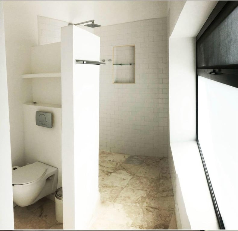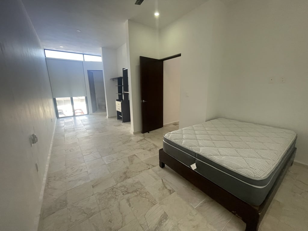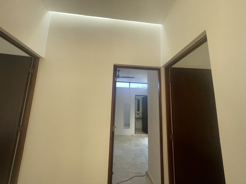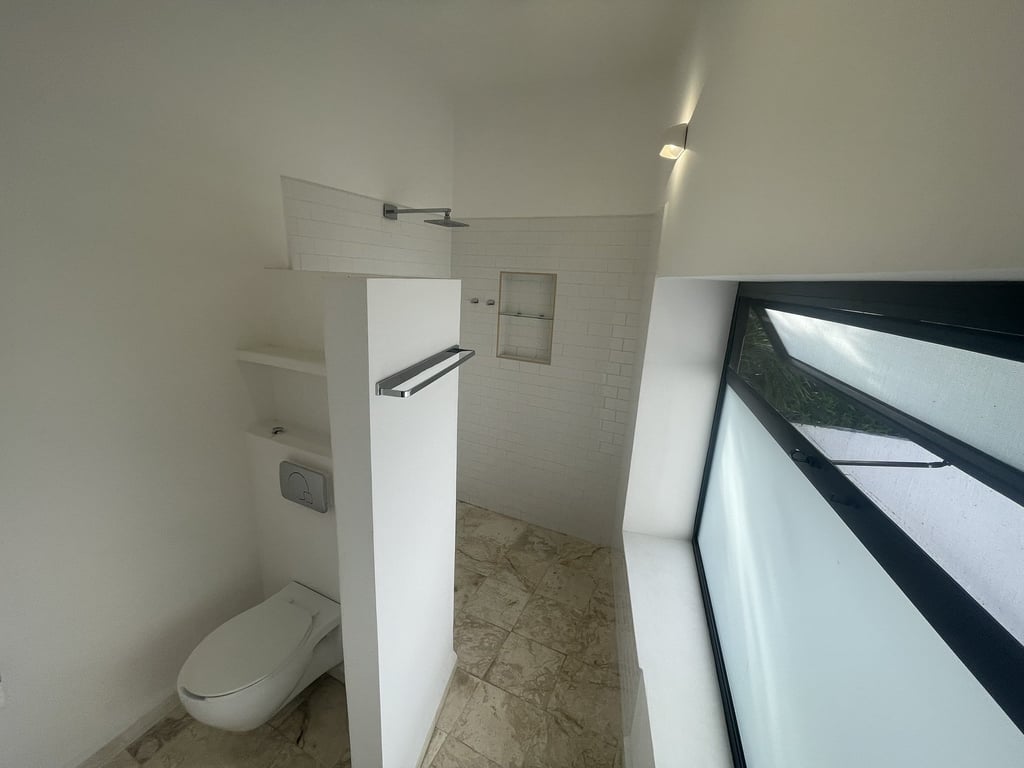 The upper level showcases true luxury through its magnificent suite arrangements. Two master bedrooms each feature walk-in closets and private en-suite bathrooms, offering hotel-level comfort and privacy. The third bedroom, complete with its own bathroom, ensures every guest or family member enjoys their personal sanctuary. All sleeping quarters benefit from individual mini-split air conditioning units, ceiling fans for gentle breezes, and the same elegant marble flooring that unifies the home's refined aesthetic. The exposed steel beams add an unexpected industrial-chic element that elevates the contemporary design vocabulary.
