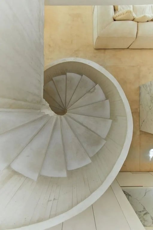 The main floor unfolds with dramatic elegance. A feature marble kitchen island anchors the open-concept space, while clever design conceals the practical elements – pantry, laundry, and full bath – maintaining the clean, contemporary aesthetic. The floating spiral staircase serves as both functional architecture and artistic centerpiece, spiraling up to the private quarters above.