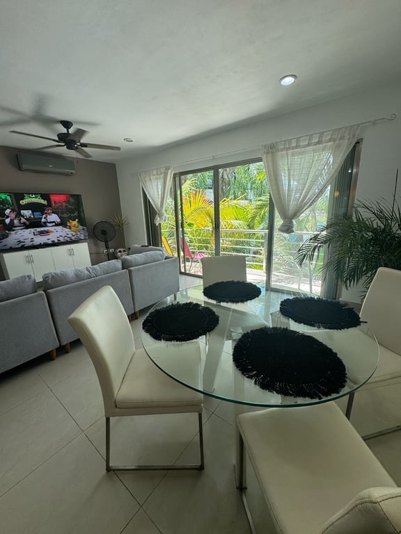 The moment you enter, an airy open-concept living and dining area welcomes you with contemporary furnishings, a generous L-shaped sectional sofa in soft neutral tones, and a modern dining set perfectly positioned for relaxed meals and evening conversations. Ceiling fans circulate the warm tropical breeze throughout the space, complementing the air flow from dual balconies that frame the living areas with natural light and lush palm-tree views. Floor-to-ceiling sliding glass doors open onto these private outdoor terraces, creating a seamless indoor-outdoor connection that is the hallmark of the finest Riviera Maya residences.